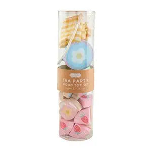 - 17-piece set. Wooden tea pot, six sweet treats, two cups, two spoons, two plates, creamer, sugar, table cloth and cake stand. Ages 3+.